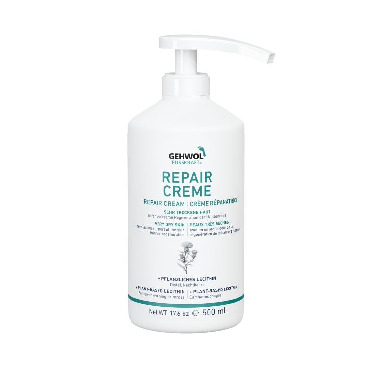 GEHWOL FUSSKRAFT Repair Cream is a powerful, fast-absorbing solution designed to repair and restore very dry, cracked, and damaged skin. Formulated with plant-based lecithin, essential oils, and nourishing ingredients, it penetrates deeply to support the skin’s natural barrier while leaving no greasy residue.