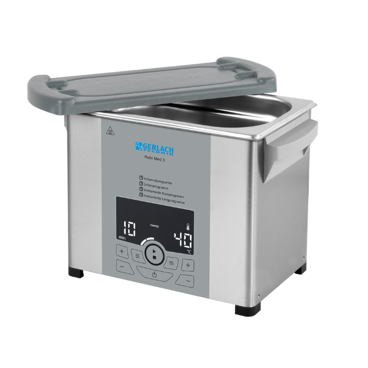 The Gerlach Podo Med 3 sets a new benchmark in ultrasonic cleaning technology for professional foot-care environments. Built for efficiency, consistency, and ease of use, it combines powerful cleaning performance with intuitive operation. With four predefined cleaning programs, it offers effortless precision and ensures optimal hygiene for every instrument. Compact, durable, and intelligently designed, it brings reliability and simplicity to every treatment room.