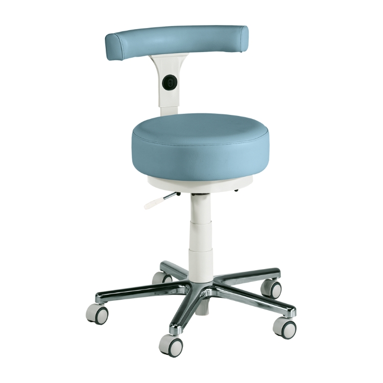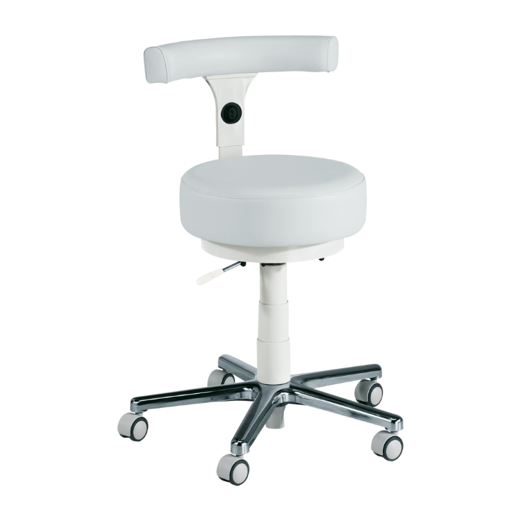 Upholstered Adjustable Backrest: The firmly upholstered backrest can be adjusted in height for personalized lumbar support, adding comfort and reducing strain during extended treatments or procedures.